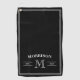 Black and white golf towel printed with your last name in an arch over your initial and the year your family was established.