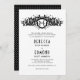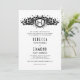 Black, white floral heraldic crest wedding invitation. It showcases a heralded crest with flowers and pomegranates and your initials or monogram. The back includes a polka dot black and white pattern.