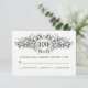 Black and white floral heraldic crest wedding RSVP response card. It showcases a heralded crest with flowers. The back includes a black and white polka dot pattern.