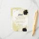 Beautiful wedding details enclosure card featuring black and white flowers and gold leaves .