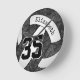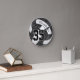 This black and white girls' volleyball wall clock with custom player name and jersey number features a floral kaleidoscopic pattern blended with the black volleyball panels and an artsy abstract swirl pattern blended with the white panels - by katz_d_zynes