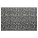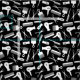 Black barber fabric with a pattern of the silhouettes of different hairdresser tools, like scissors, combs, hair dryers, hair trimmers in white against a black background.