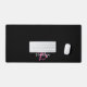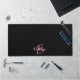 This personalized desk mat features a monogram and first name in modern hot pink and white script on a black background.