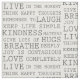 Black and white inspirational quotes: kindness matters, love, live in the moment, hugs, think happy thoughts etc...