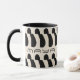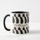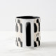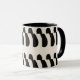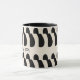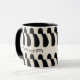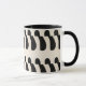 Black and white/light pink beige abstract oblong shaped patterned coffee mug.