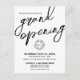 A bold and elegant black and white postcard invitation designed for a business grand opening, product launch, or brand event. The front features “Grand Opening” in oversized handwritten script calligraphy that stretches across the top and off the edges of the card for a dramatic, sophisticated statement.