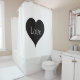 White shower curtain with a black heart and white Love text print. Matching bath decor available at the ScriptoGraphic Gift Store.