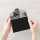 A plain, simple and minimalist black and white design comprising of 4 photo templates set on a white background with black fonts. The cover is plain black and has a pretty black and white scalloped edged frame for your guests details. The tear off strip currently caters for a weekend away function but the wording can be personalized to suit whatever your requirements may be. These are ideal for engagement party announcements.