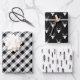 Rustic wrapping sheets, perfect for Christmas and bachelor parties and birthdays, with three matching patterns in black and white: plaid, deer, and pine trees.