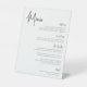 Display your wedding or event menu selections in modern style with this simple and elegant pedestal sign featuring soft black lettering on a crisp white background. "Menu" or your custom header appears at the top in modern handwritten script lettering. Personalize with your menu items beneath, aligned at the right.