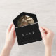 This all-in-one invitation features an elegant modern minimalist style with a clean and simple block serif typography fonts in an arch shape photo along with monogram initials with a black and white background. The simplicity of this design adds a touch of elegance to your wedding. It works well with many wedding themes and definitely a great addition to your wedding. Just customize the names and wording in a few easy steps and personalize the all-in-one invitation card with your photo of the happy couple and replace the QR Code with yours to give your invitation a nice personal touch. This invitation will save you money to send everything at once. It has a perforated RSVP postcard can be easy to tear off and your guest just sends it to you. Just simply fold each card into the outlined shape -- seal and send to your guests. No envelope is needed for shipping -- just postage.