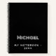 A chic black background, white text. Personalize and add your name and a text. For school, work as a sketchbook, diary and journalling.