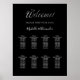 A classic black background. Personalize and add the name of the bride and groom, add your guests names. White text.