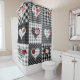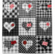 Seamless background pattern. Will tile endlessly. Black and white patchwork with hearts and red patches.