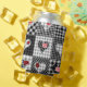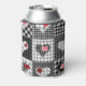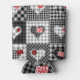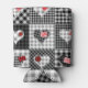 Seamless background pattern. Will tile endlessly. Black and white patchwork with hearts and red patches.