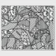 "Patterns Run Amok, 4" is the fourth in a series of black and white whimsical designs featuring a hand-drawn outline that's then filled in with repeating patterns. Circles, rings, squares, bulls-eye, targets, flowers and more are interspersed over the surface in an unpredictable array.