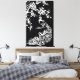 Black white peacock and cherry blossoms custom wrapped canvas print, featuring a white silhouette of a peacock bird and a cherry branch -sakura tree- with lovely flowers on black background. A B&W design with an oriental Asian flair.
