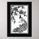 Black white peacock and cherry blossoms custom poster print, featuring a black silhouette of a peacock bird and a cherry branch -sakura tree- with lovely flowers on white background. A B&W design with an oriental Asian flair.
