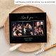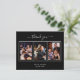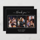 Add 3 of Your birthday photos, vertical size, a date, name, and the thank you note. A classic black background with white text and frame. The text: Thank you on the front and your name on the back are written with a stylish hand lettered script with swashes.
