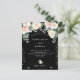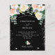 A trendy bright colourful floral wedding invitation in blush pink, rose gold and white. A black background, decorated with large, lush watercolored flowers, florals in white, rose gold, blush pink with some eucaluptus greenery. Faux silver glitter dust. Personalize and add your names and wedding details. White text.