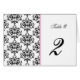 Chic wedding reception table number tent card done in a lovely black and white damask pattern, on the left side and solid white, on the right side of the card. A thin pink line separates the two different backgrounds. Black text and number, on the right white side is ready to personalize. Change number and text for each table at your reception.