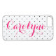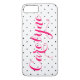 Stylish iPhone case featuring black and white polka dots pattern and hot pink modern calligraphy. This customizable electronics case will be perfect as a gift.