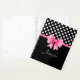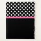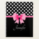 Planner with a stylish pink bow and ribbon on a back and white polka dots pattern design. Type your name in the template field to personalize the notebook.