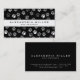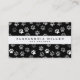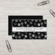 Modern business card features a stylish and whimsical puppy dog paw print pattern in a black and white colour palette with light and charcoal grey paw prints on a black background with custom name and title or role presented on a white banner with coordinating black accents and text. The back of the card is plain and simple with coordinating text on a black background. Stylish animal themed business cards that are perfect for pet sitters, dog walkers, groomers, doggie day cares, veterinarians, other animal professionals or more.