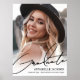This simple and minimalist graduation party sign features a full-page photo with a soft white gradient overlay at the bottom, paired with clean black text for a fresh, modern look. “Graduate” is displayed in elegant handwritten script, with the graduate’s name, “Class of 2026,” and the school name shown below in classic black serif fonts for a crisp, easy-to-read design.