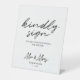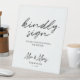 A simple minimalist white background and black script text "kindly sign" wedding table sign to encourage your guest to sign your wedding guest book.
