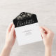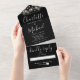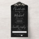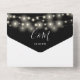 All in one modern minimalist wedding invitation featuring pretty string lights and elegant signature script name and monogram initials on a black background. The invitation includes a perforated RSVP card. Designed by Thisisnotme©