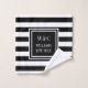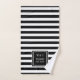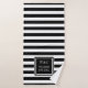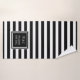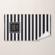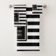 Elegant personalized initials monogram bath towel set featuring a black and white striped pattern with your initials and family name with your established date set in a black-bordered square with a classic white text. Designed by Thisisnotme©