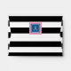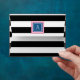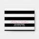 Striped RSVP envelope in black and white with a pink lining personalized with your address. The back is decorated with a monogram in matching pink and blue.