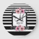 Black & White Stripes Pink Floral Monogram Large Clock