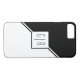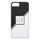 Black and white geometric iPhone 8/7 Case with monogram. The front includes two diagonal stripes one black and one white that separate the card in two triangles. A white square is on the centre with your monogram.