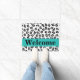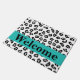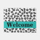 Welcome visitors to your home with this stylish and sophisticated black and white leopard skin pattern door mat. This door mat is customized with the word Welcome that you can change to another word or name. A turquoise teal blue strip gives an area for personalization and a pop of colour. Enjoy this popular and contemporary design that will add a trendy home decorative accent. This leopard design is available in several colour combinations in this store.