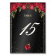 Elegant Black Background with Red Roses and Gold Accents Quinceañera Table Numbers. Easily personalize the information on these quince Table Numbers and you have your own custom made Table Numbers to match your quinceañera theme! Please view our Black with Red Roses Quinceañera Collection for complimenting and matching decor for your quince años celebration. Numerous Para Mesas negro con rosas rojas para quince años.
