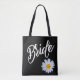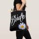This tote is designed with a white daisy on a black background, with the word Bride written across the top! Makes a great bag for her special day.