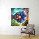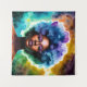Tapestry features striking brown-skinned black woman wearing glasses with afro hair merged with nebulas against a galaxy universe background.