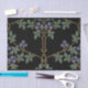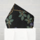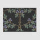 Tissue paper with the design by William Morris of a blackberry vine with blue-violet flowers on a black background.