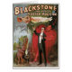 This vintage advertising poster is of Harry Blackstone dates 1934. In this colourful poster Blackstone is preforming the illusion of levitation. A brewing cauldron is tended to by a little devil. Satan stands behind Blackstone.