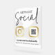 Acrylique obtenons un signe social avec des touches blanches imprimées, votre code QR et l'icône faux or des médias sociaux personnalisées avec votre poignée de médias sociaux. Panneau promotionnel des médias sociaux avec polices noires et traits de peinture blanc imprimés sur un arrière - plan acrylique personnalisé avec votre code QR afin que vos clients et clients puissent facilement accéder à vos médias sociaux.