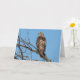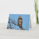 A photograph of a red tailed hawk perched on a branch with a bright blue sky in the background.