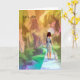 Blank note card with a colourful image of a girl walking her dog in a magical park.