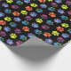 A fun and colourful wrapping paper featuring rainbow paw prints on a black background.