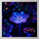 A cosmic dreamscape where a wireframe bloom and mushroom glow with electric blue and amber light against a starry bokeh void—an ultraviolet art print