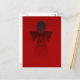 This postcard features a silhouette of an angel walking through a river of blood that almost reaches to top of her head. The background is blood red.