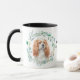 "CAVALIER KING CHARLES SPANIEL" is the text at the centre of this mug. Each side of the mug has a beautiful watercolor portrait of an adorable Blenheim spaniel in a blue green leaf wreath. Between the two images is the text, which may be easily customized, or even removed, by you.