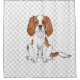 Destei's original cartoon illustration of a cute blenheim colour Cavalier King Charles Spaniel breed dog who is sitting. The background has a pattern of grey dog paw prints.