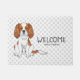 Destei's original cartoon illustration of a cute blenheim colour Cavalier King Charles Spaniel breed dog who is sitting. There is also text that now reads "Welcome" together with a personalizable text area for a family name or other custom text. The background has a pattern of grey paw prints.